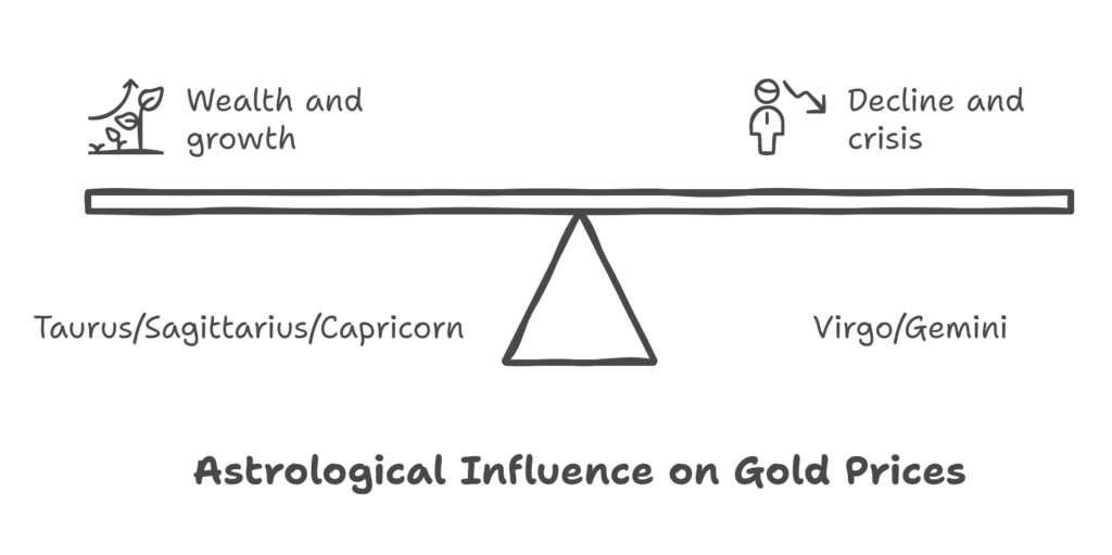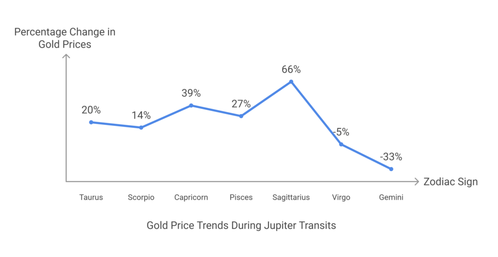 Jupiter’s transits through Taurus, Sagittarius, and Capricorn correlated with significant gold price increases, while Virgo and Gemini saw declines. Though not necessarily causal, patterns align with astrological themes (e.g., Taurus = wealth, Capricorn = crisis).